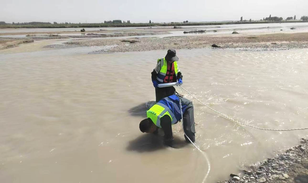 孙晓雷(前)与同事在浅水区开展地区水环境国控断面水生生物现场监测工作。