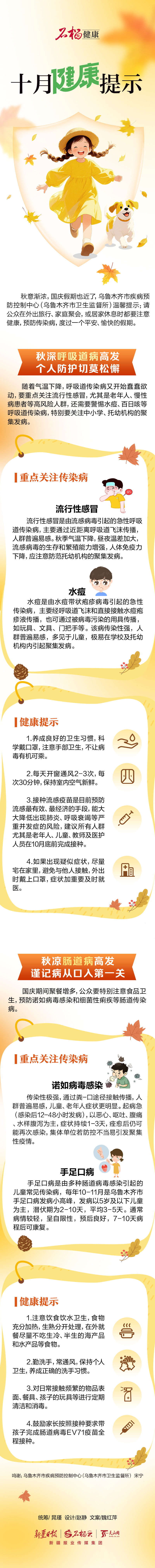 秋意渐浓,国庆假期也近了。乌鲁木齐市疾病预防控制中心(乌鲁木齐市卫生监督所)温馨提示:请公众在外出旅行、家庭聚会,或居家休息时都要注意健康,预防传染病,度过一个平安、愉快的假期。