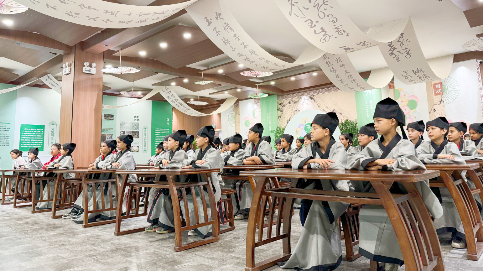 庆典仪式在庄严肃穆的释奠礼乐中正式开始。国学大讲堂内传来朗朗诵读声,学生们手捧典籍齐声诵读《论语》经典篇章;在临摹区内,参与者专注描摹《论语》卷轴金句,在一笔一画间体悟经典内涵,现场洋溢着浓厚的文化氛围。