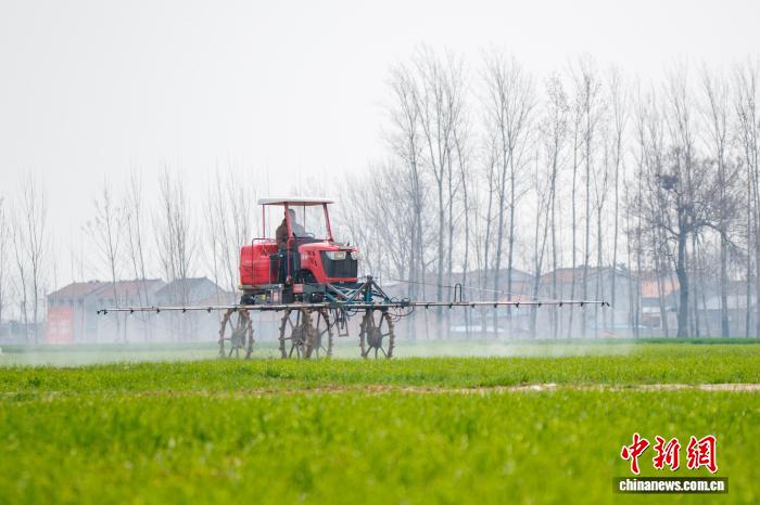 3月19日,在河南省商丘市睢县董店街道赵楼村一处农田内,农技人员正在驾驶自走式高杆喷雾机对小麦进行田间管理作业。 徐泽源 摄