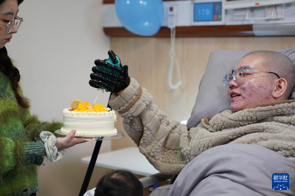 3月28日,邓先生通过脑机接口控制外骨骼给蛋糕插上蜡烛。新华社记者 周密 摄