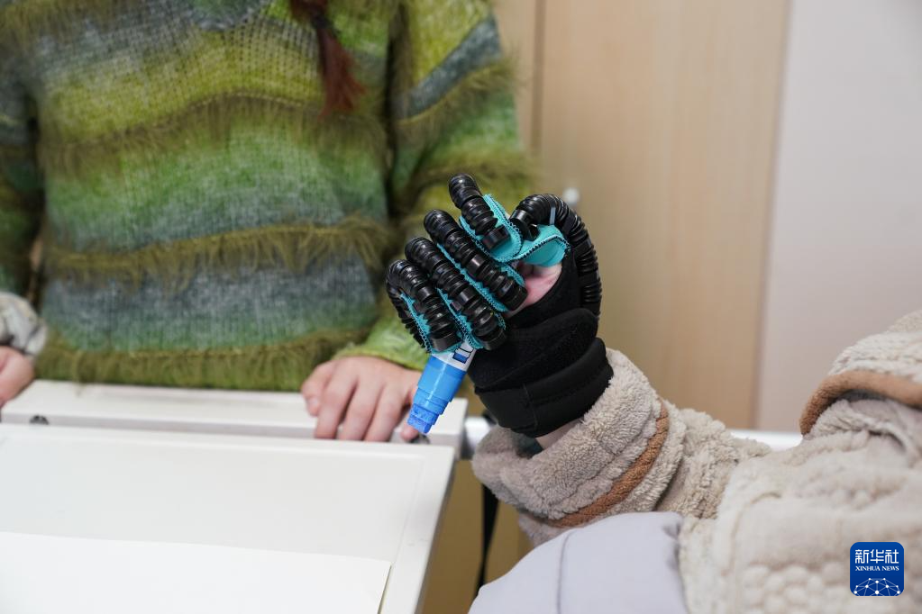 3月28日,邓先生通过脑机接口控制外骨骼握笔绘画。新华社记者 周密 摄