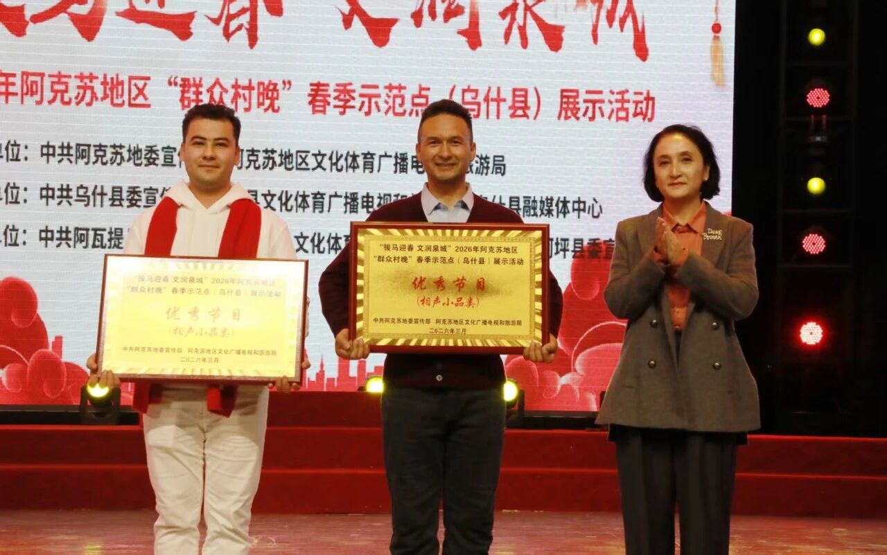 苹果红了/阿克苏地区融媒体中心讯(记者 张路 通讯员 阿不都萨拉木·尼牙孜报道)春风送暖,泉城欢歌。3月10日,“骏马迎春 文润泉城”2026年地区“群众村晚”春季示范点(乌什县)展示活动举行。乌什县、阿瓦提县、柯坪县三地基层文艺团队欢聚一堂,以自编自导自演的文艺节目,为各族群众献上一场接地气、有温度、聚民心的文化盛宴。