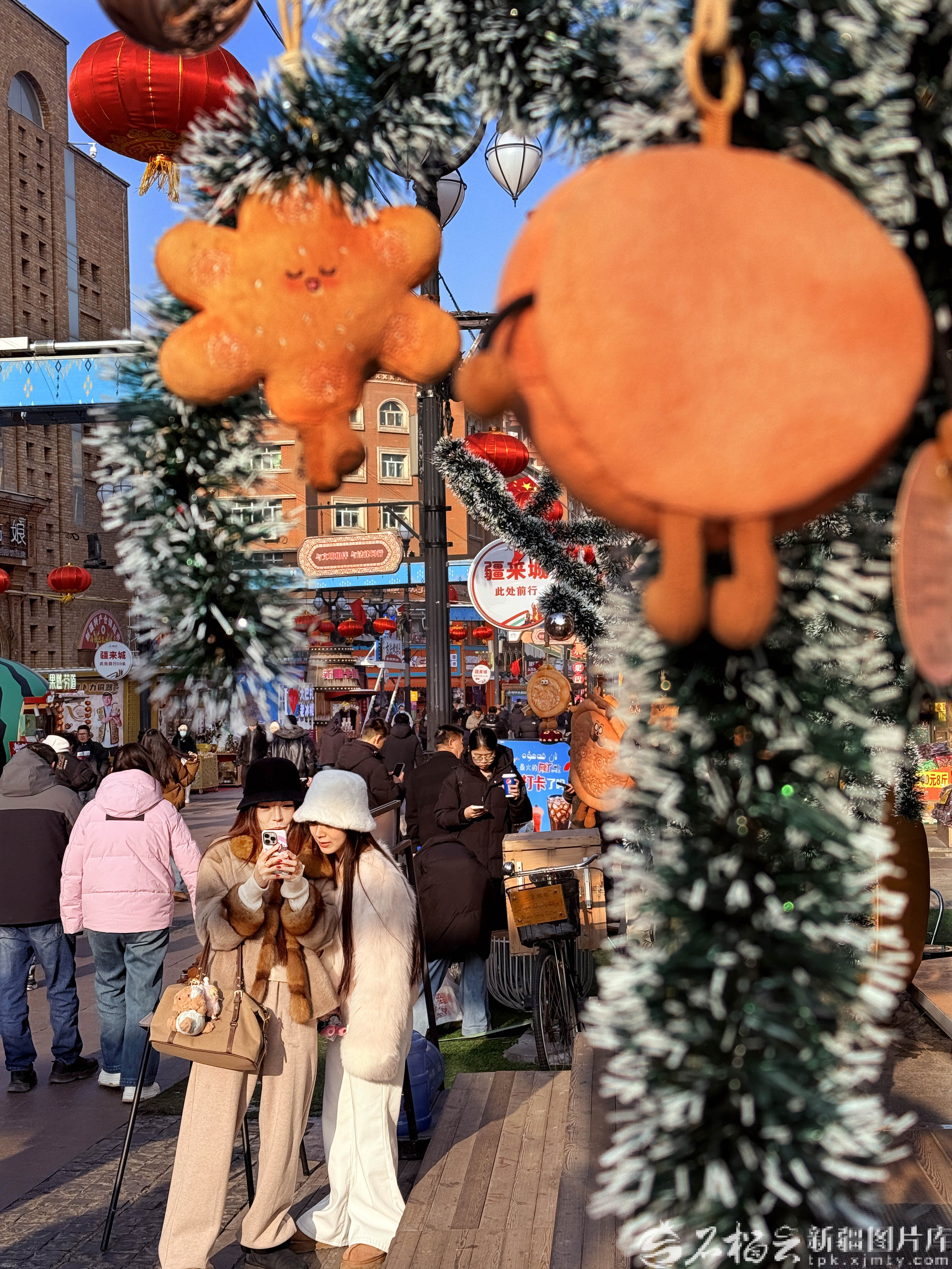 1月8日,游客在新疆国际大巴扎步行街拍照打卡。