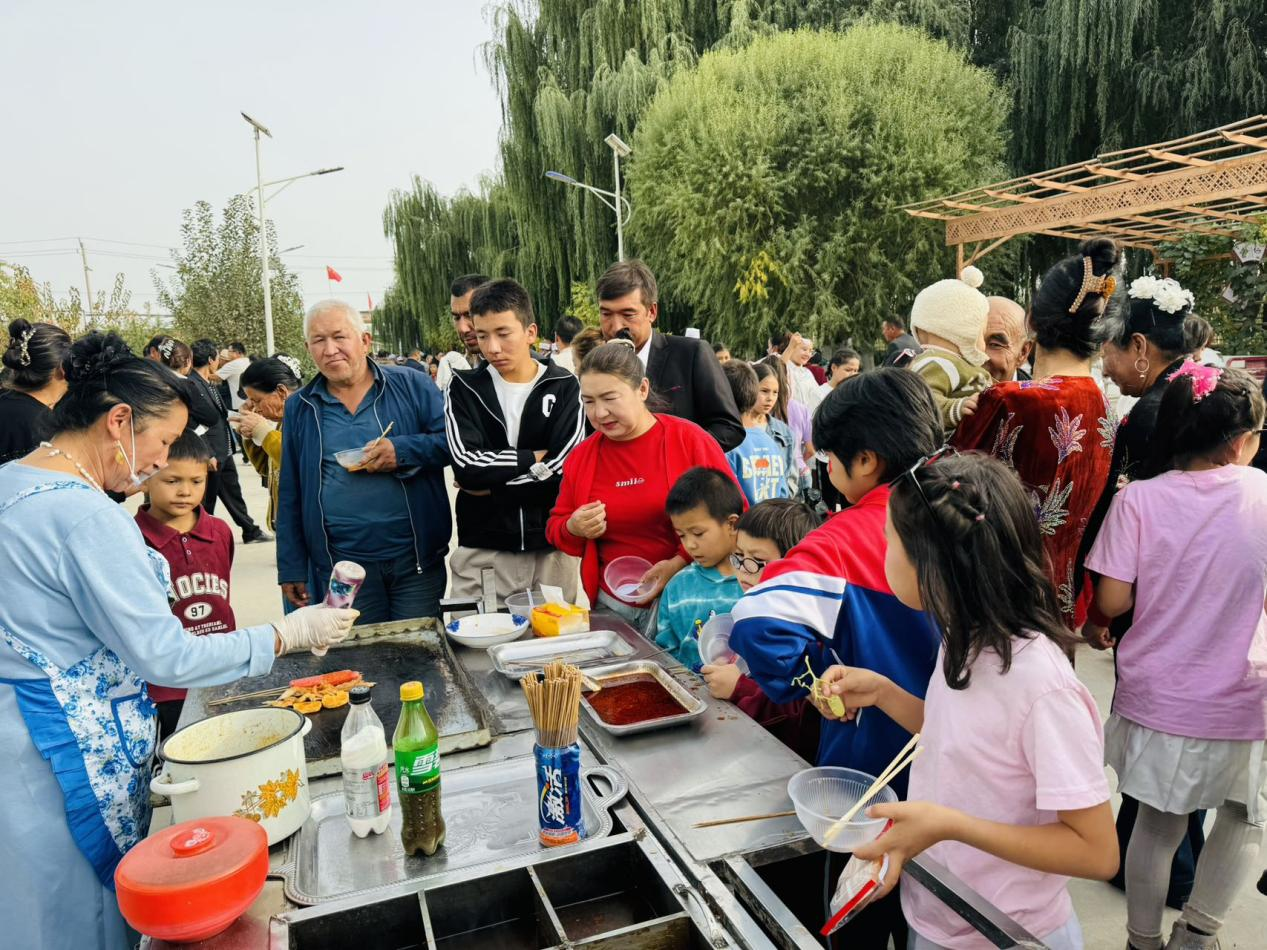 以火焰的温度,碰撞舌尖的美食;以中秋的篝火,赐予月亮下的相聚。白天,由工作队、村“两委”、群众代表踊跃报名组成的40余户美食制作区香味四溢,蒸炸煮烤尽显乡土风味,吆喝品尝热闹非凡,活动现场处处洋溢着喜庆祥和的气息,鲜艳的五星红旗迎风招展。村民们早早来到现场,大家在品尝美食中诉说着家乡的变化,脸上满是期待与笑意,活动为每名参赛代表精心准备了奖品,参加比赛与互动的村民均获得相应奖励。晚间,精彩的文艺演出在热烈的掌声中拉开帷幕,由村民自编自导自演的文艺节目轮番登场,成为整场活动的“重头戏”。舞蹈队队员身着靓丽服饰,伴随着欢快的旋律翩翩起舞,灵动的舞姿展现出村民们积极向上的精神风貌;《最美的还是我们新疆》、《但愿人长久》等暖心歌曲将现场气氛推向高潮,台下村民齐声跟唱,期间穿插着趣味互动游戏,笑声掌声环绕着全场。月亮慢慢漏出了尖尖,在呐喊中场地中间燃起了团结的篝火,温馨的氛围感染着在场的每一个人,大家围在篝火四周转圈跳舞,尽情享受节日带来的美好。