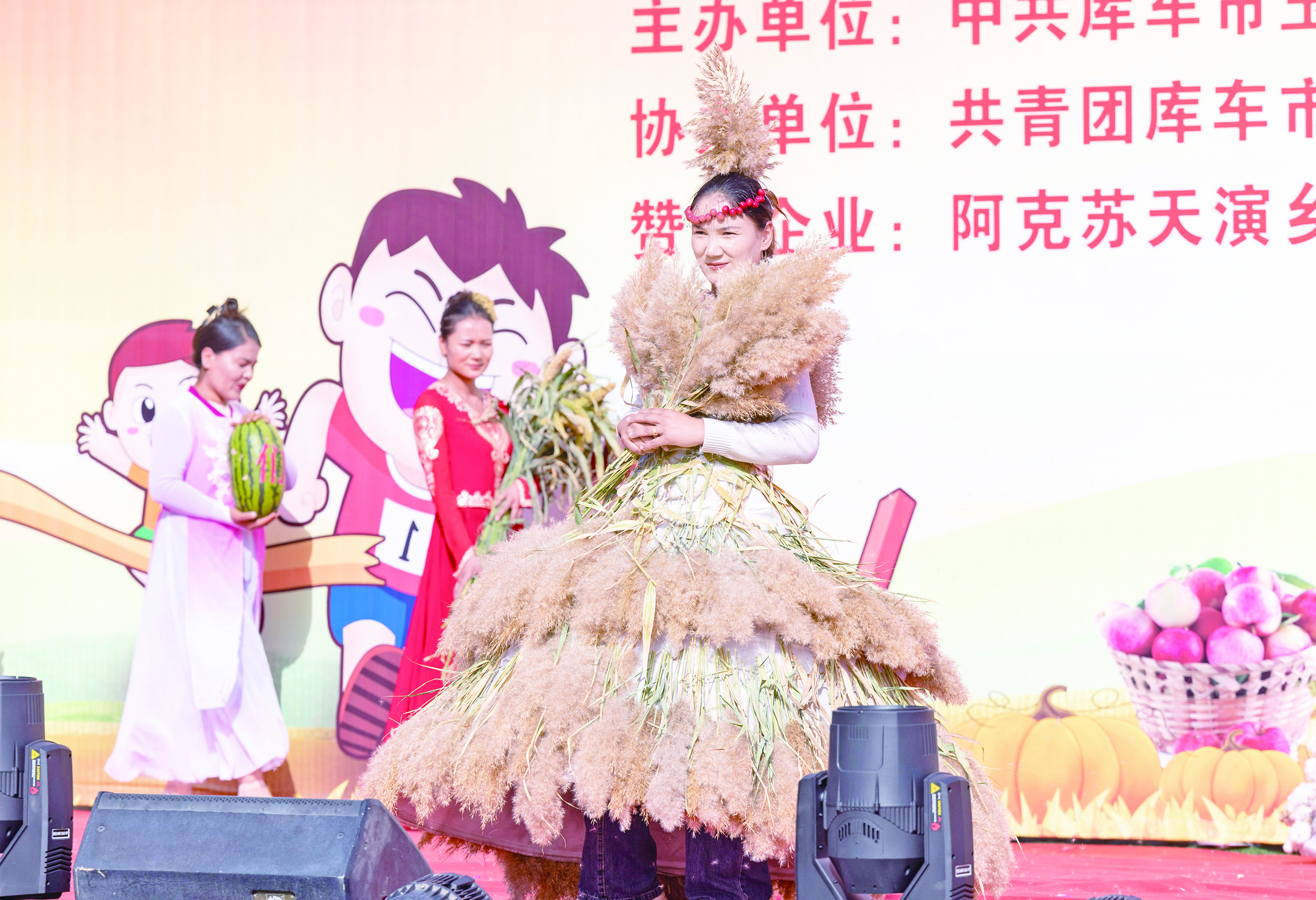 10月18日,库车市玉奇吾斯塘乡举行以“七十华诞耀天山 农牧欢腾庆丰年”为主题的农牧民运动会,来自各村的群众身穿用辣椒、豆角、玉米等农作物和蔬菜制作的服饰走秀,展示秋季丰收的喜悦和甜美生活的幸福。 通讯员 袁欢欢 摄