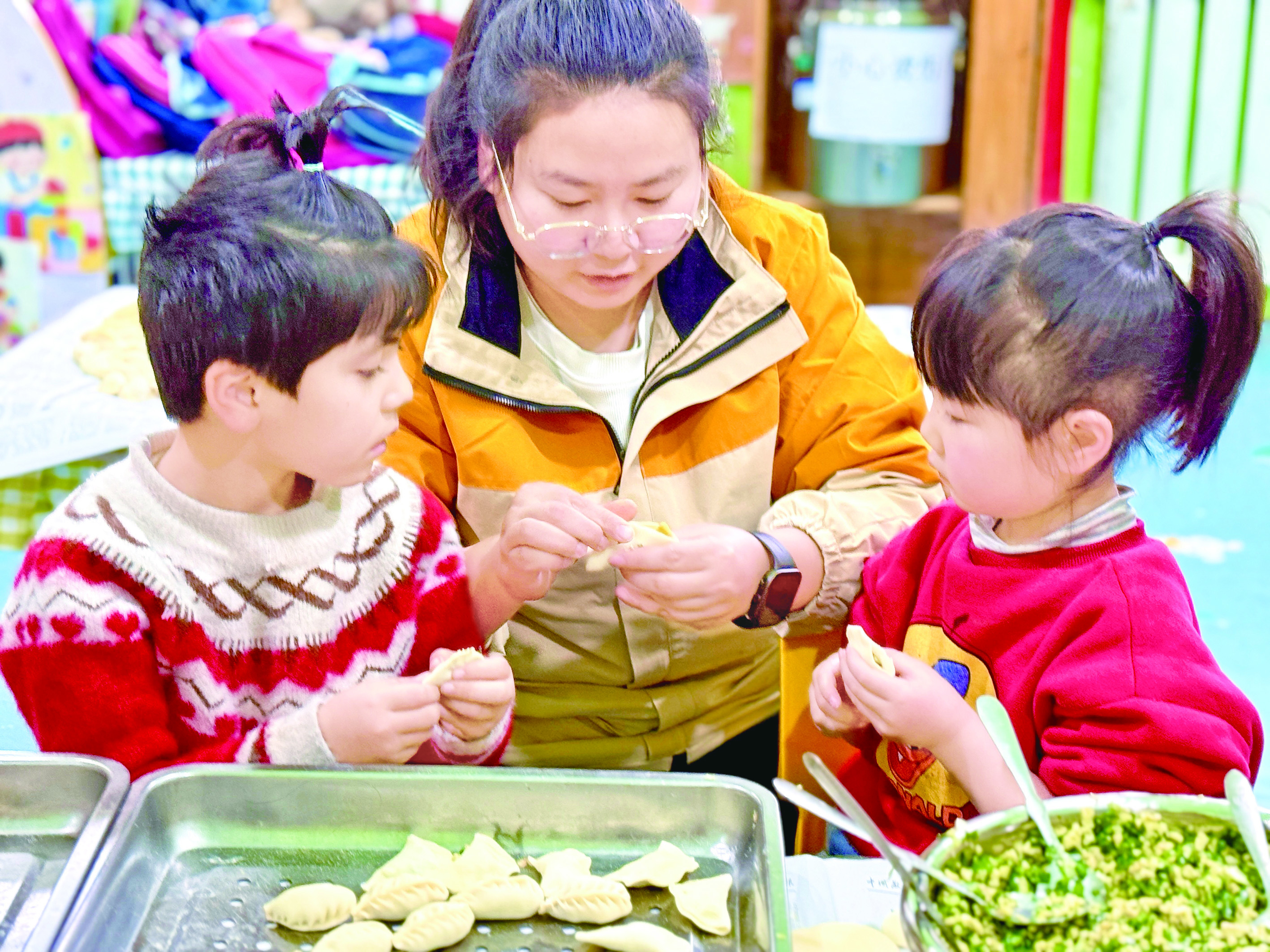12月19日,温宿县阿热勒镇第一中心幼儿园老师在教小朋友包饺子。 通讯员 艾则孜·沙木沙克 摄