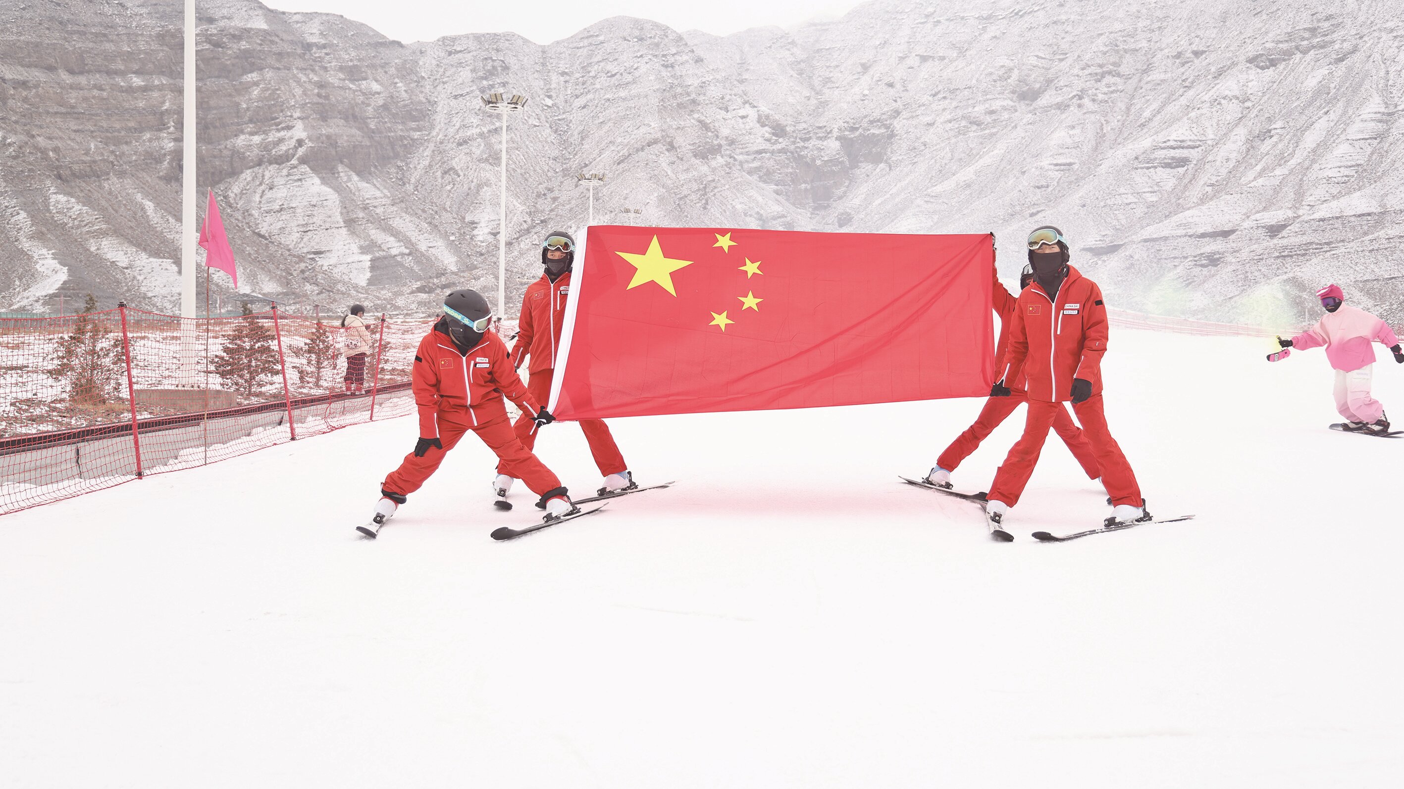 滑雪爱好者手持国旗将运动激情与家国情怀融为一体。