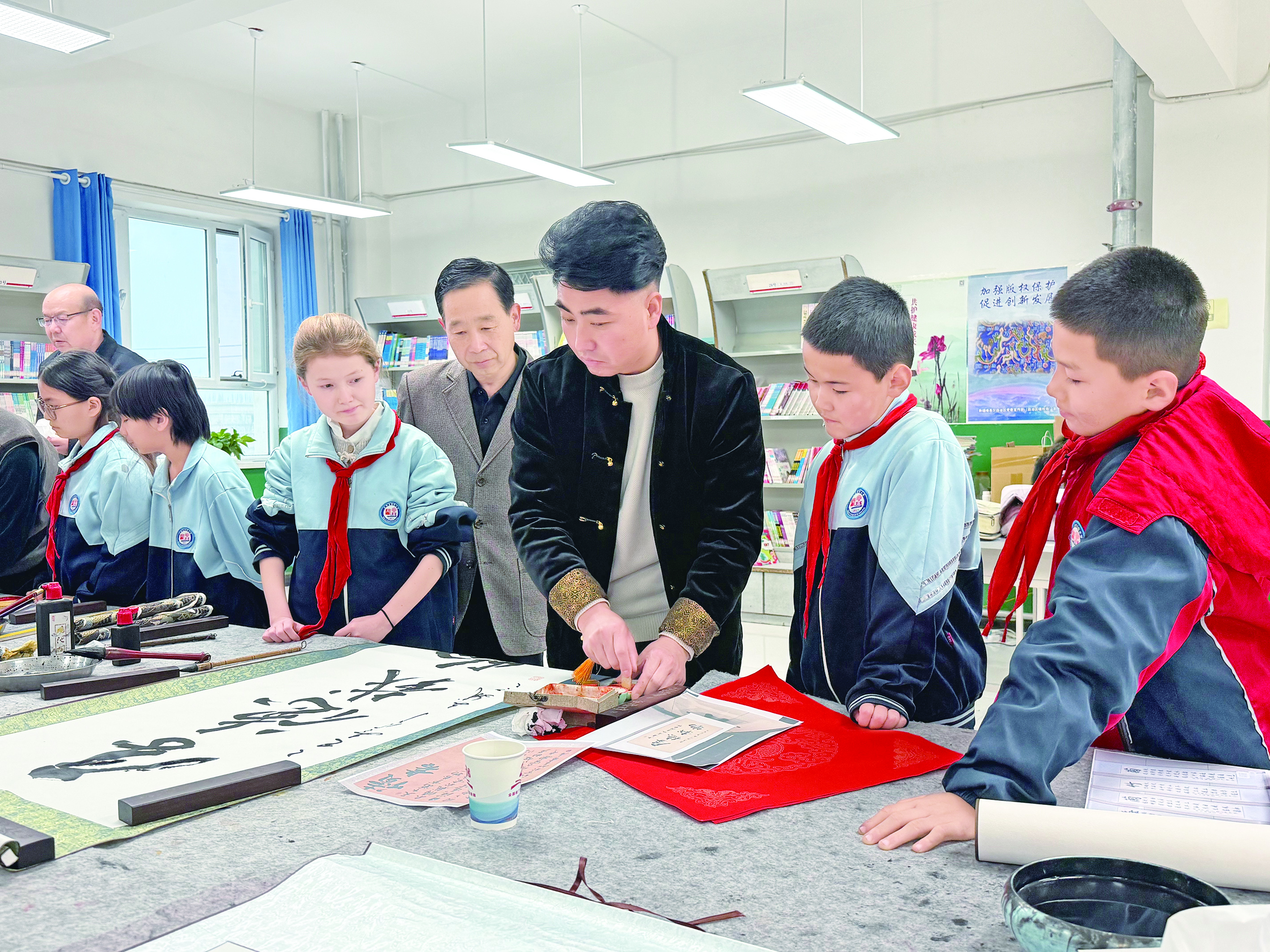 2025年12月31日,沙雅县文联组织书法家协会骨干走进该县第四小学,开展“墨香迎新年 文化润校园”活动。书法家们挥毫泼墨,为师生送上新年祝福。 通讯员 祖丽皮耶·艾麦尔 摄