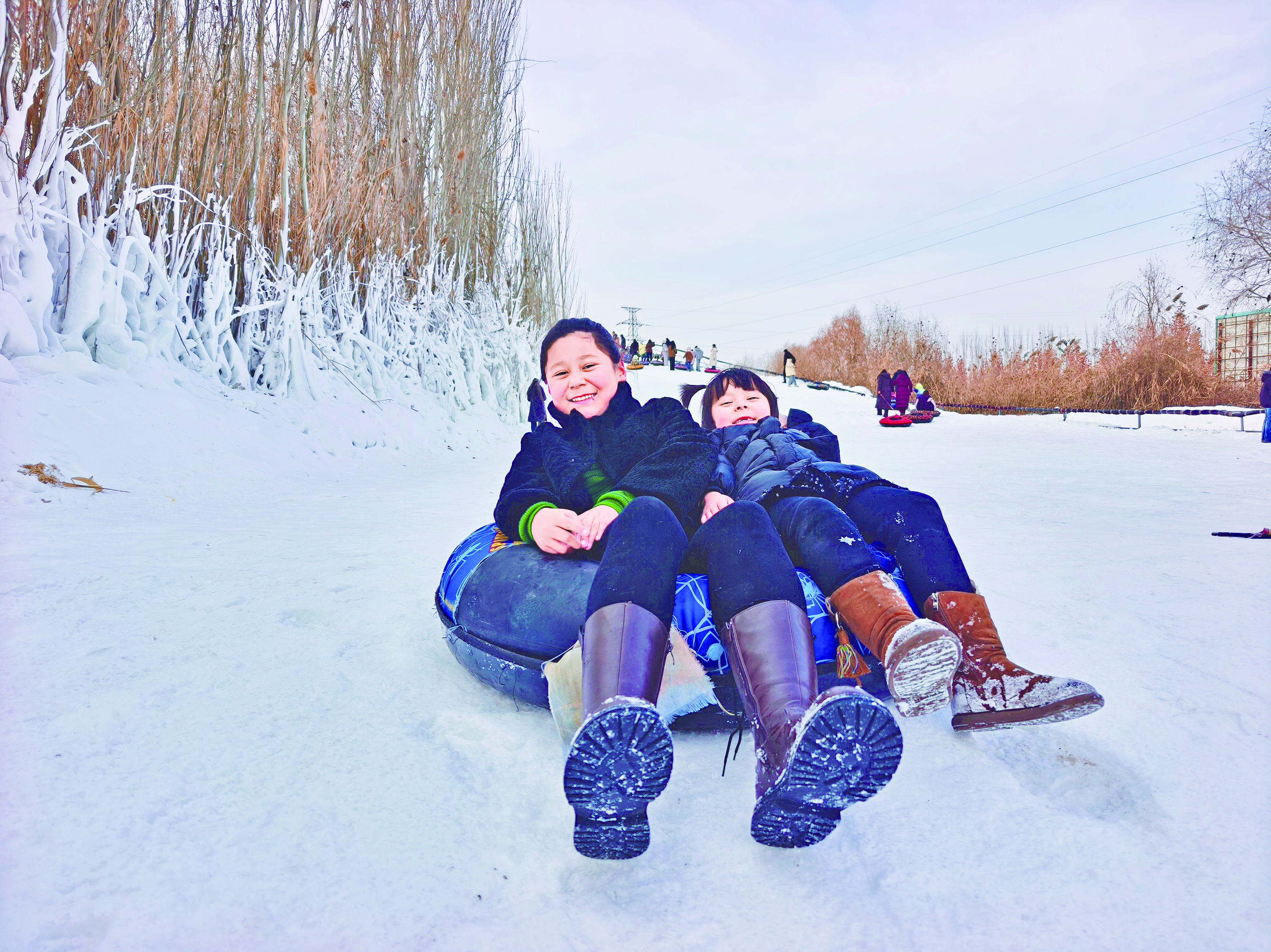 1月2日,游客在阿克苏国家湿地公园冰雪游乐场玩雪圈。