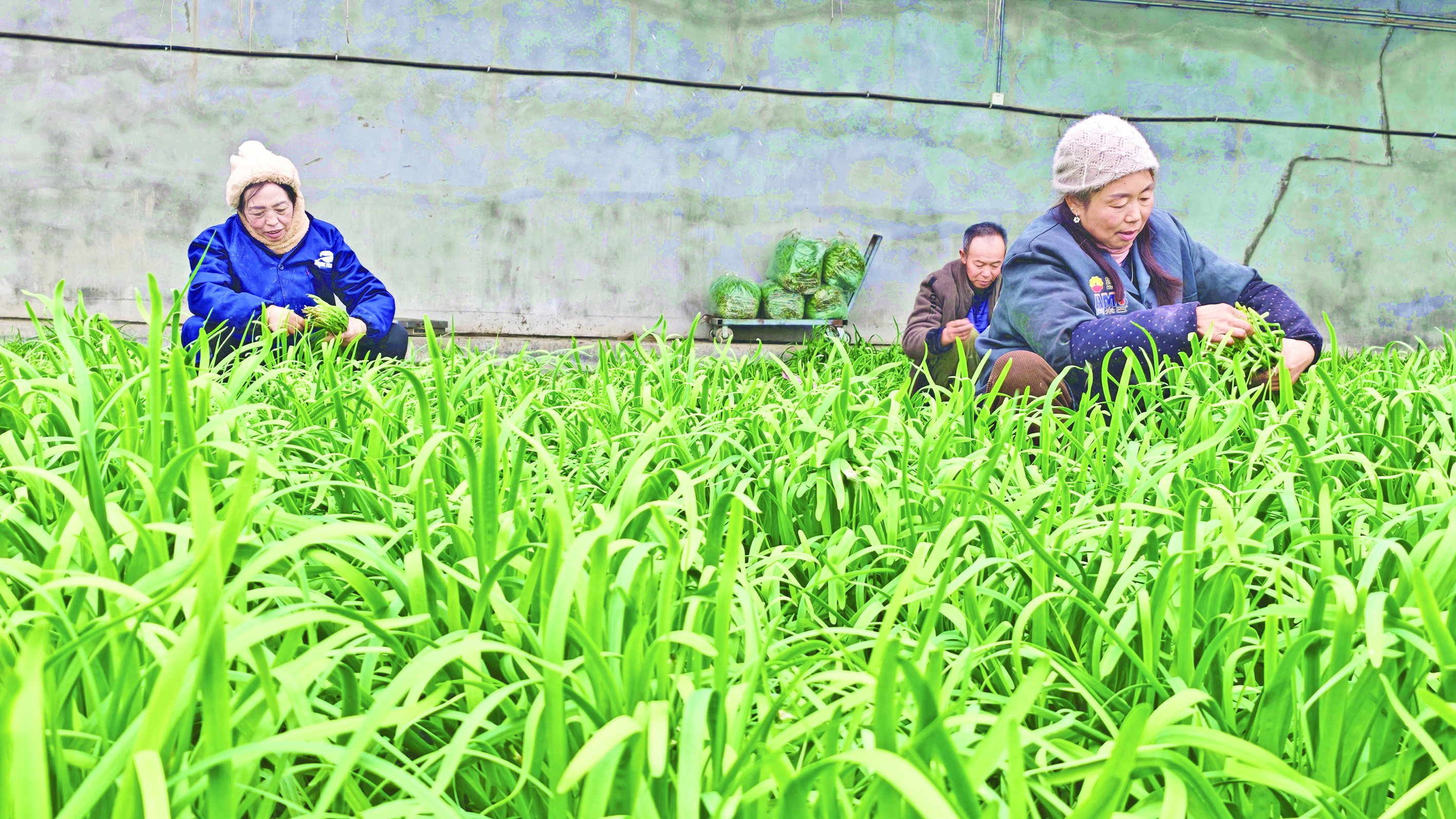 1月4日,在阿瓦提县乌鲁却勒镇红旗村蔬菜种植基地,村民正忙着采收韭菜。 通讯员 包良廷 摄