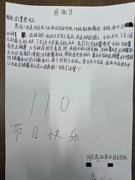 民警寻回遗失手机 学生手写感谢信