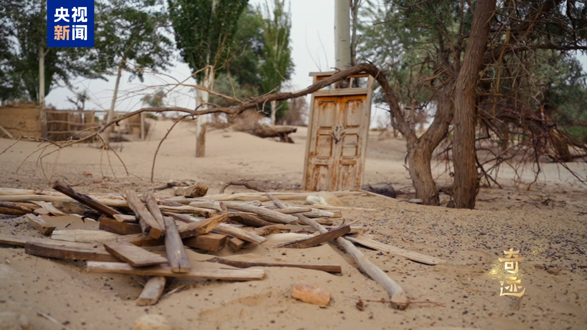 在新疆和田地区策勒县英阿瓦提老村,村民奥布力亚森·麦麦提敏站在旧址前。一扇破旧的木门还立在原地。土炕还在,炉膛里残存着当年烧火做饭的印记。但更多的生活痕迹,早已被风沙层层覆盖。