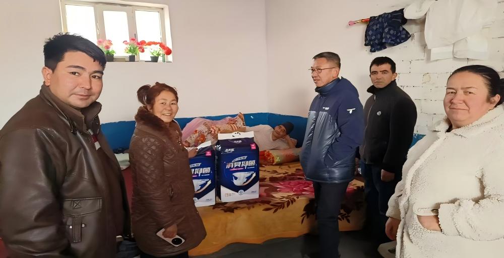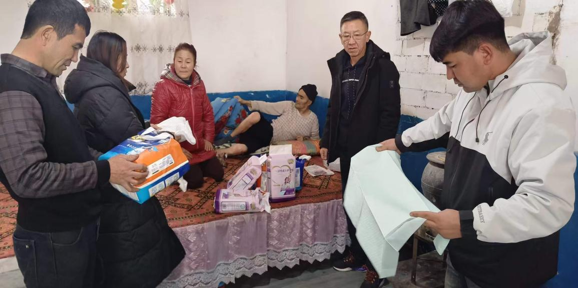 走访过程中,工作队了解到患有精神障碍的村民买买提·阿布拉因病情影响生活,长期卧床且出现失禁情况,仅靠姐姐一人照料,家庭负担较重。为解决这一实际困难,工作队员细心询问其身体情况和护理需求,自费为其采购专用护理用品。当工作队将两箱崭新的护理垫送到床边时,买买提·阿布拉的姐姐感动地说:“这些东西正是我们最需要的,你们太细心了!”