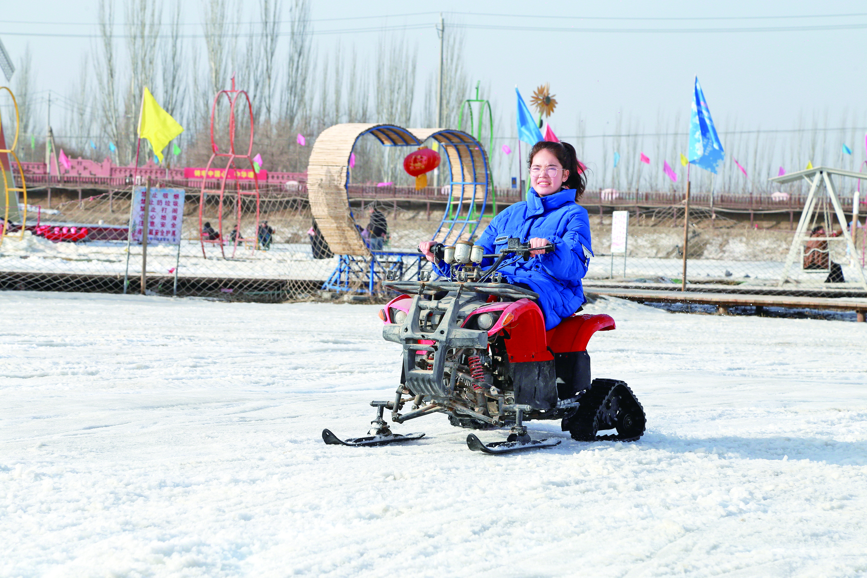 1月27日,游客在阿克苏市皇宫湖沙漠湖泊旅游度假区内的滑冰场体验冰上碰碰球项目。 通讯员 魏源 摄
