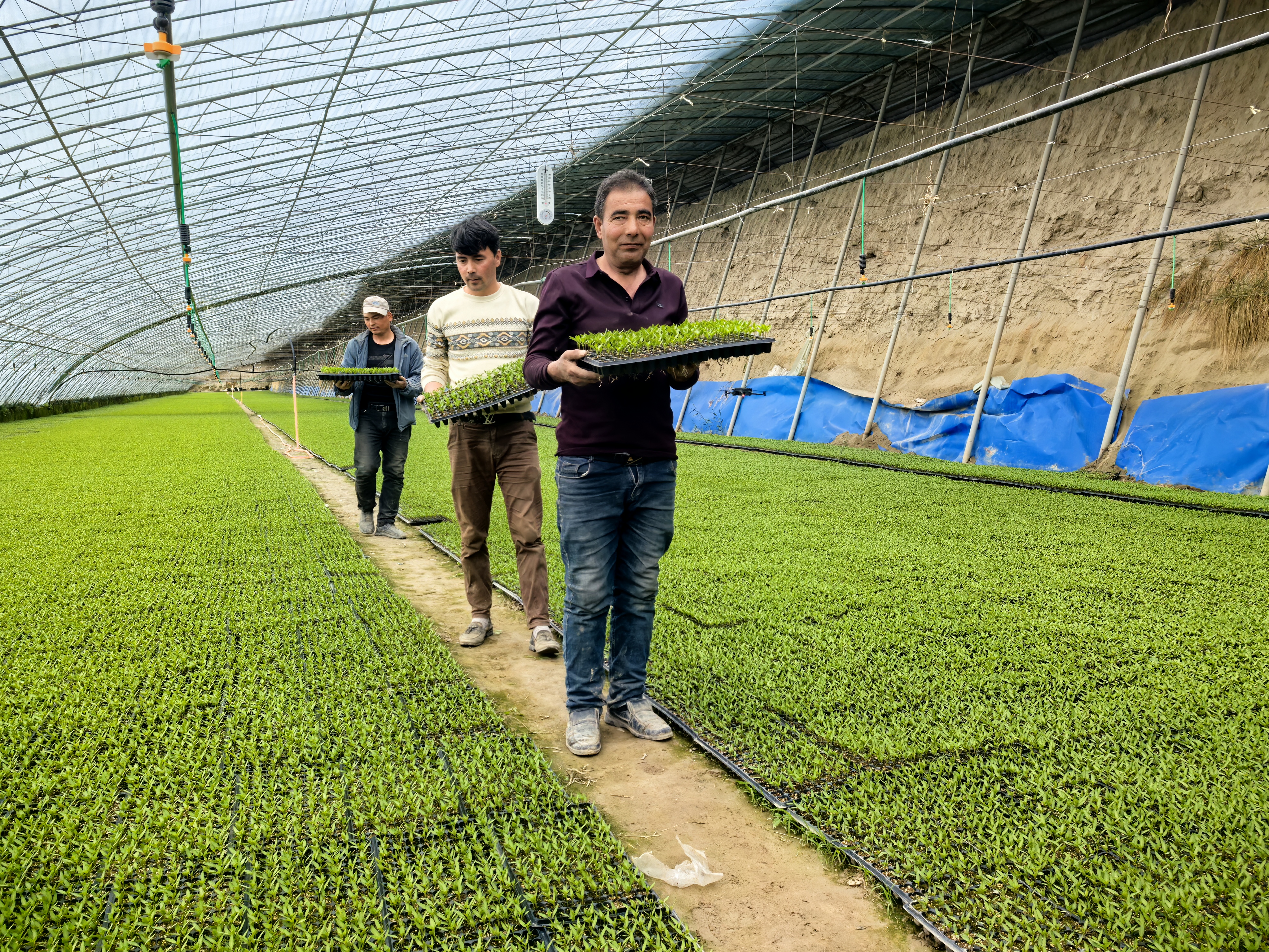 基地负责人杨平介绍,当前基地培育有30万张辣椒苗、1万张西红柿苗,还有西瓜、甜瓜、青菜等种苗,另有50万株营养杯药材苗即将发往阿拉尔用于荒漠治理。