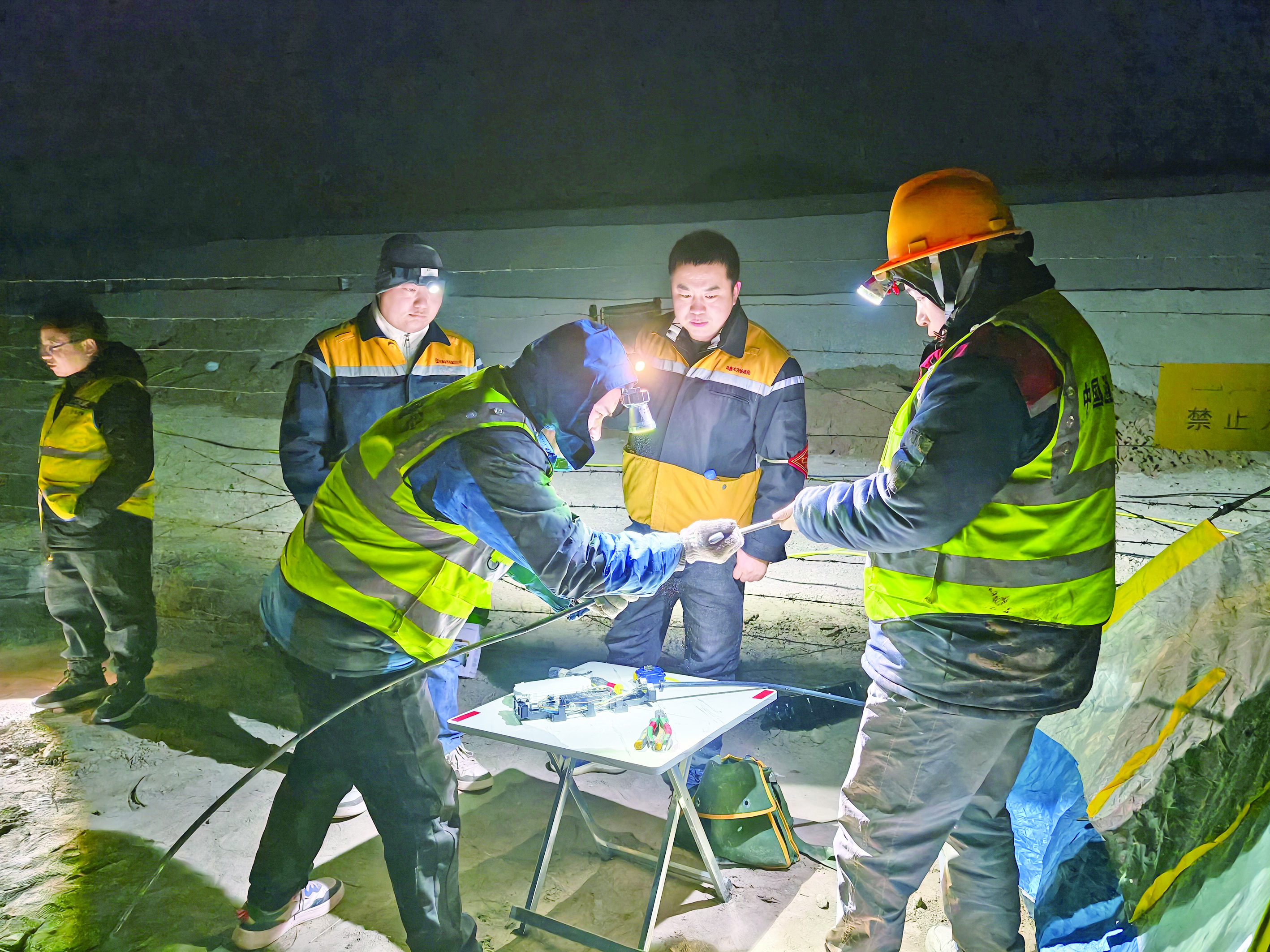 夜晚,施工人员利用铁路行车天窗时段,进行光缆割接作业,精准完成光缆接续、测试等工序。