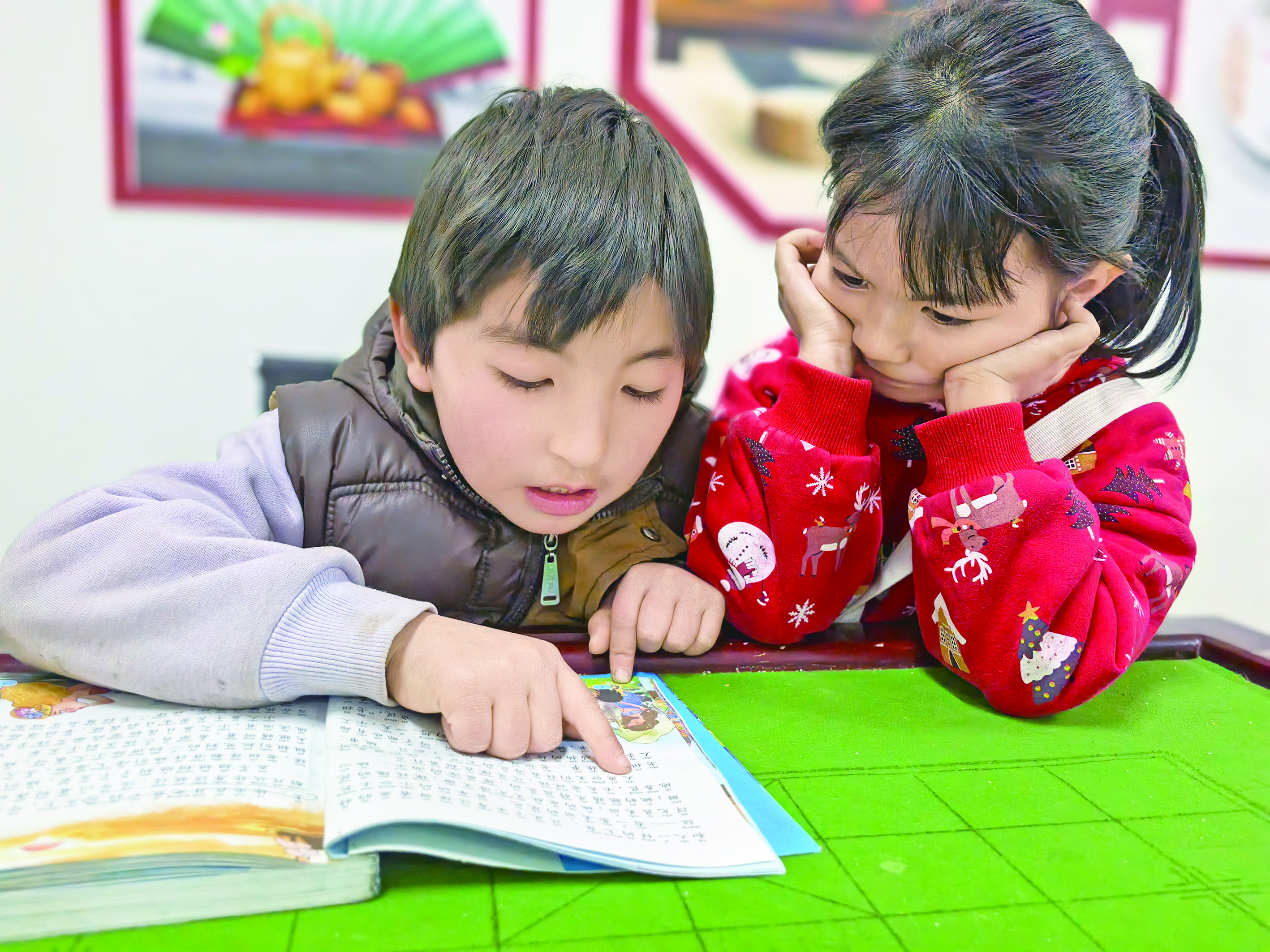近日,沙雅县红旗镇先进村图书室小朋友在读书。 通讯员 董成忠 摄