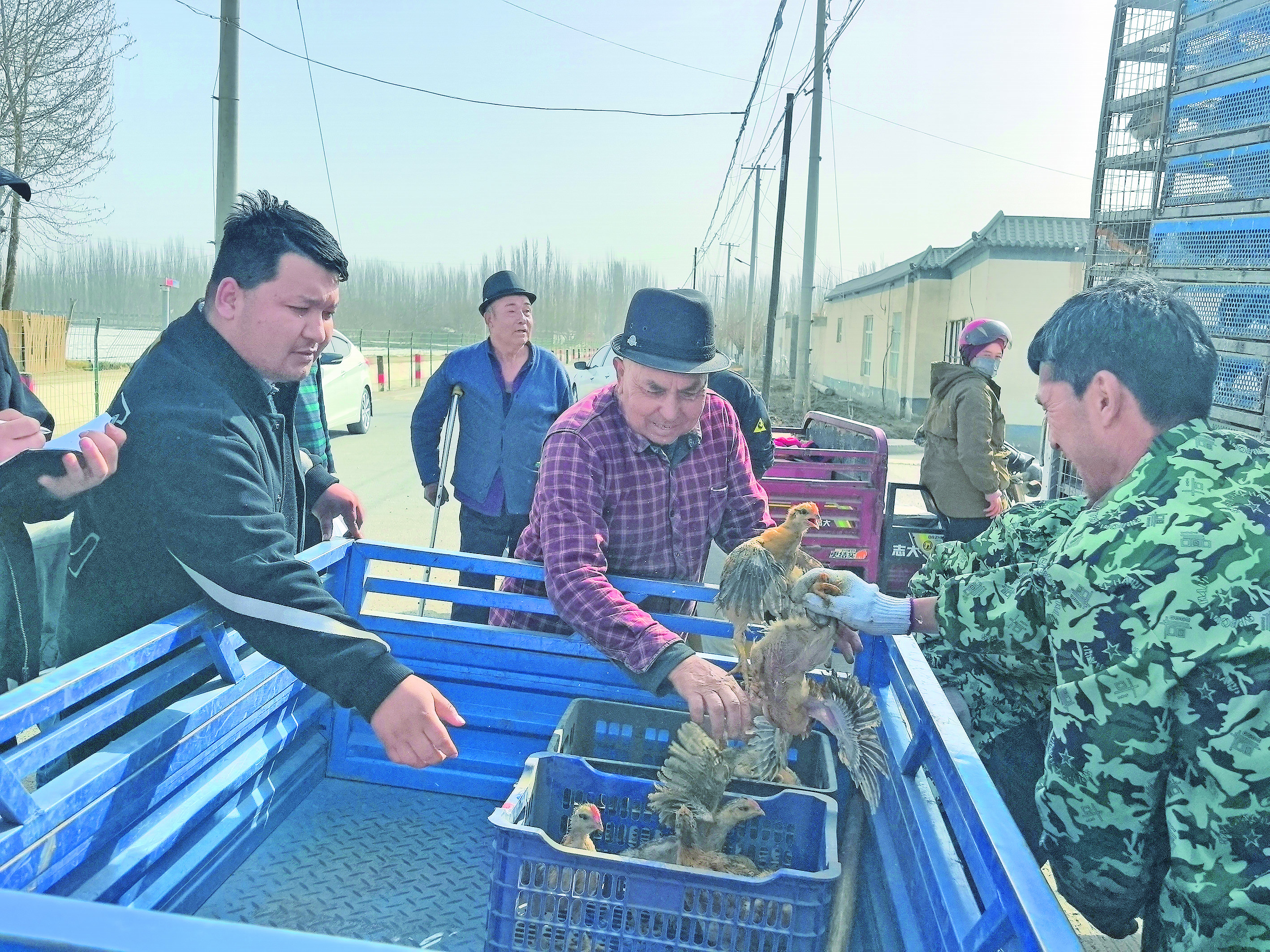 3月19日,阿克苏地区融媒体中心驻沙雅县红旗镇先进村工作队为群众发放3000只鸡苗,助力庭院经济发展。 通讯员 董成忠 摄