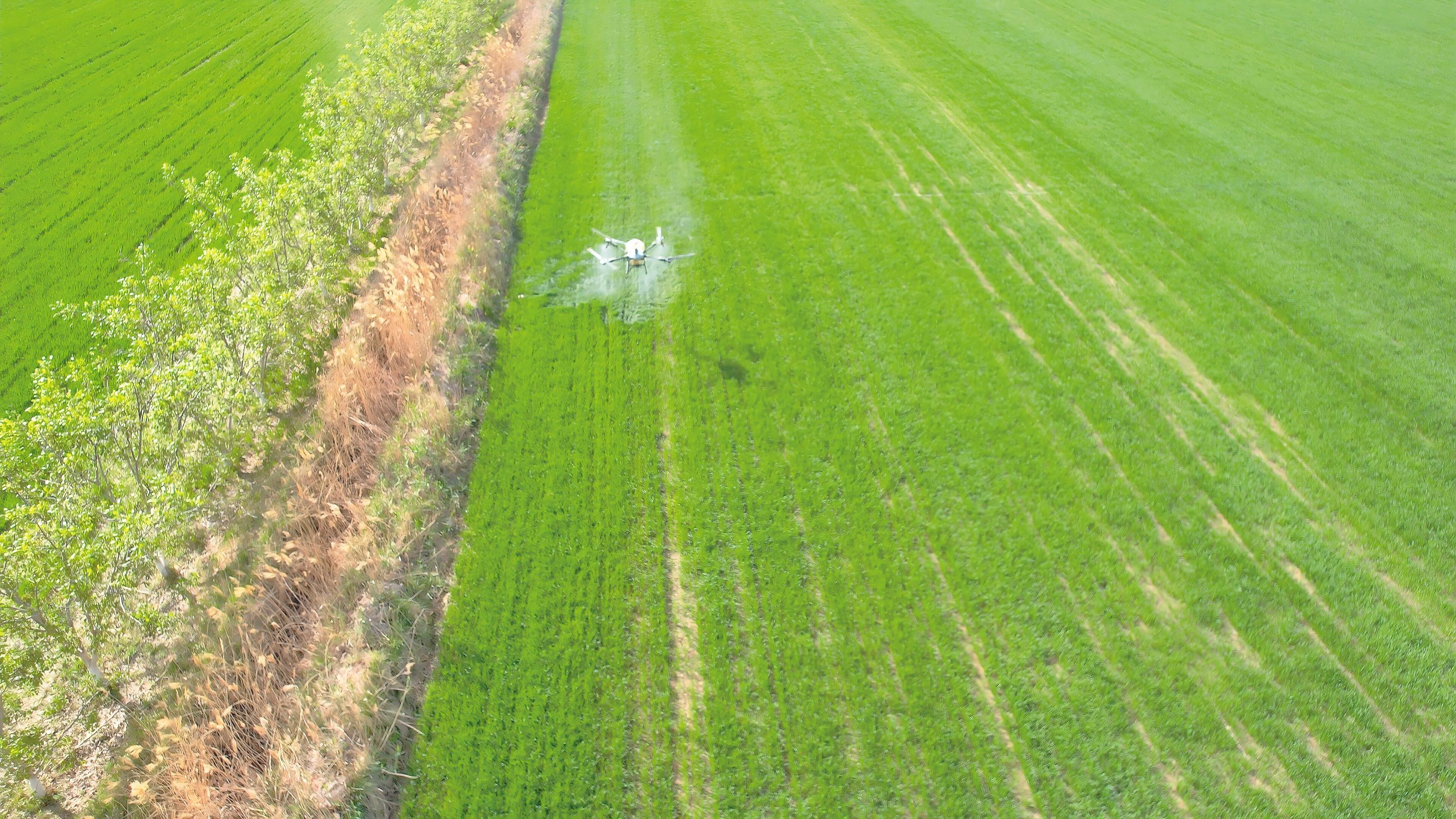 4月17日,走进前进镇汗都村一高标准农田,随着嗡嗡声,一架无人机贴地掠过麦田,雾化后的药液均匀洒落,仅几分钟便完成大片区域的喷洒作业。