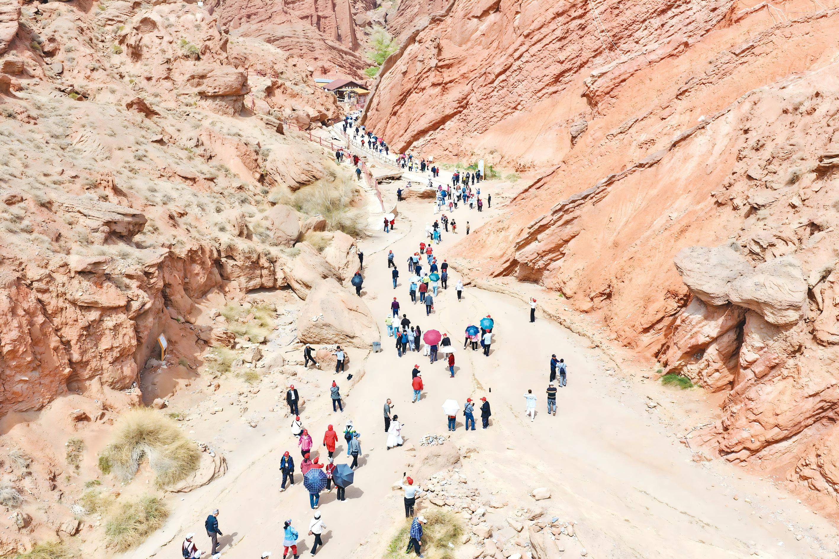 4月22日,游客在库车天山神秘大峡谷游玩。当日,库车市迎来“夕阳红文旅崛起号”援疆专列,来自江西、广西、四川等地的游客在库车天山神秘大峡谷、库车王府、大馕城等景区景点赏景拍照、品尝特色美食,感受当地的风土人情。 通讯员 吐尔松·托胡提 摄