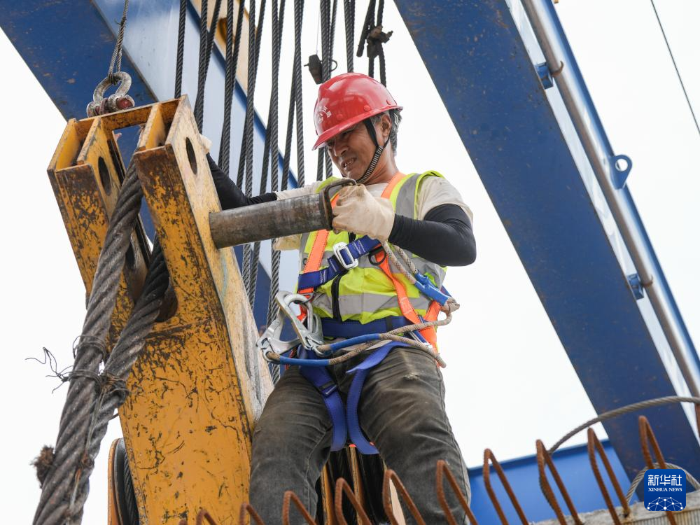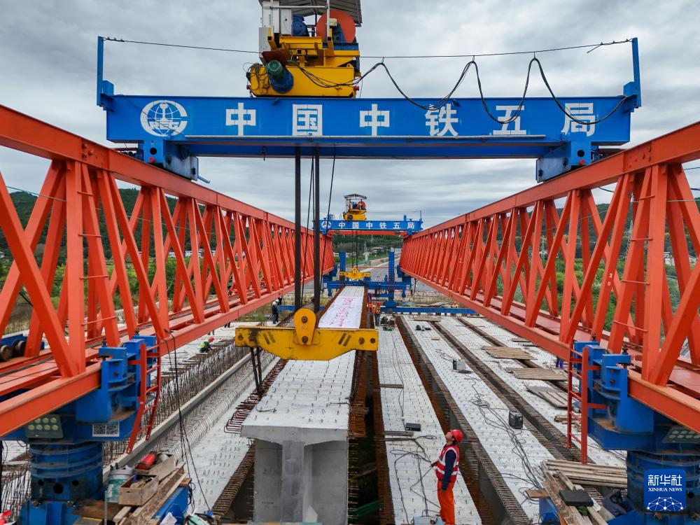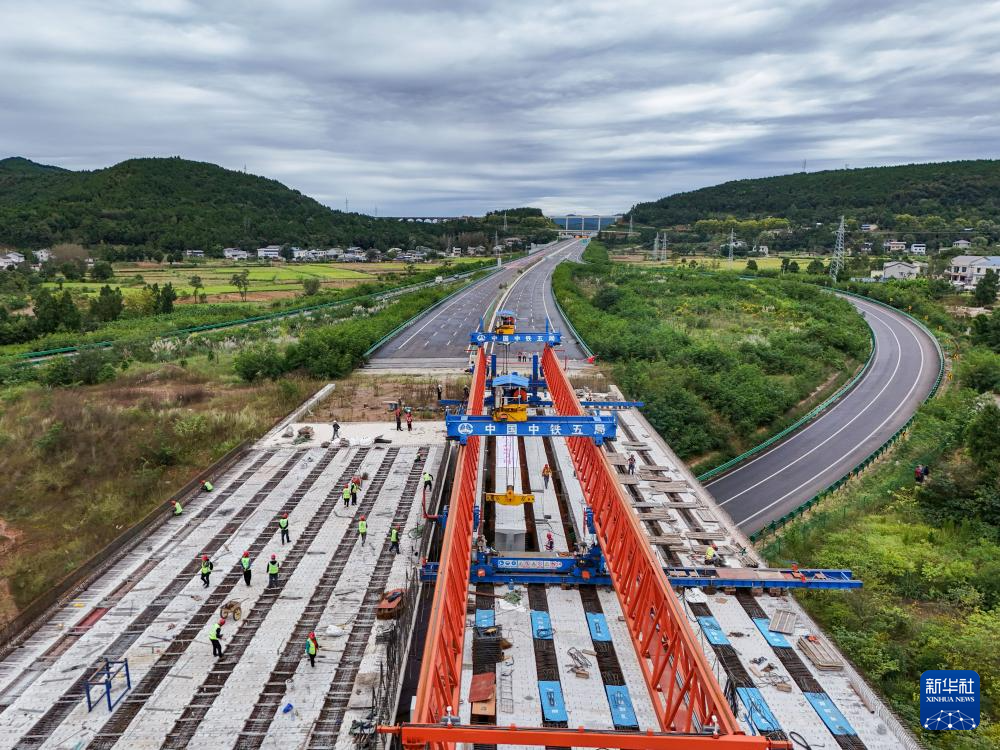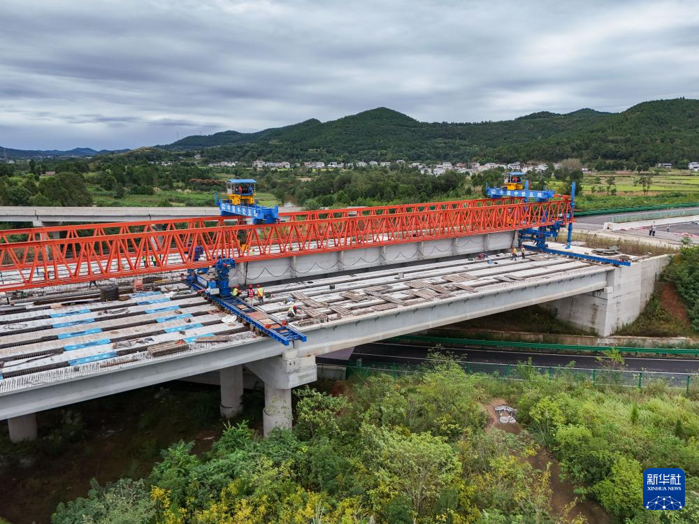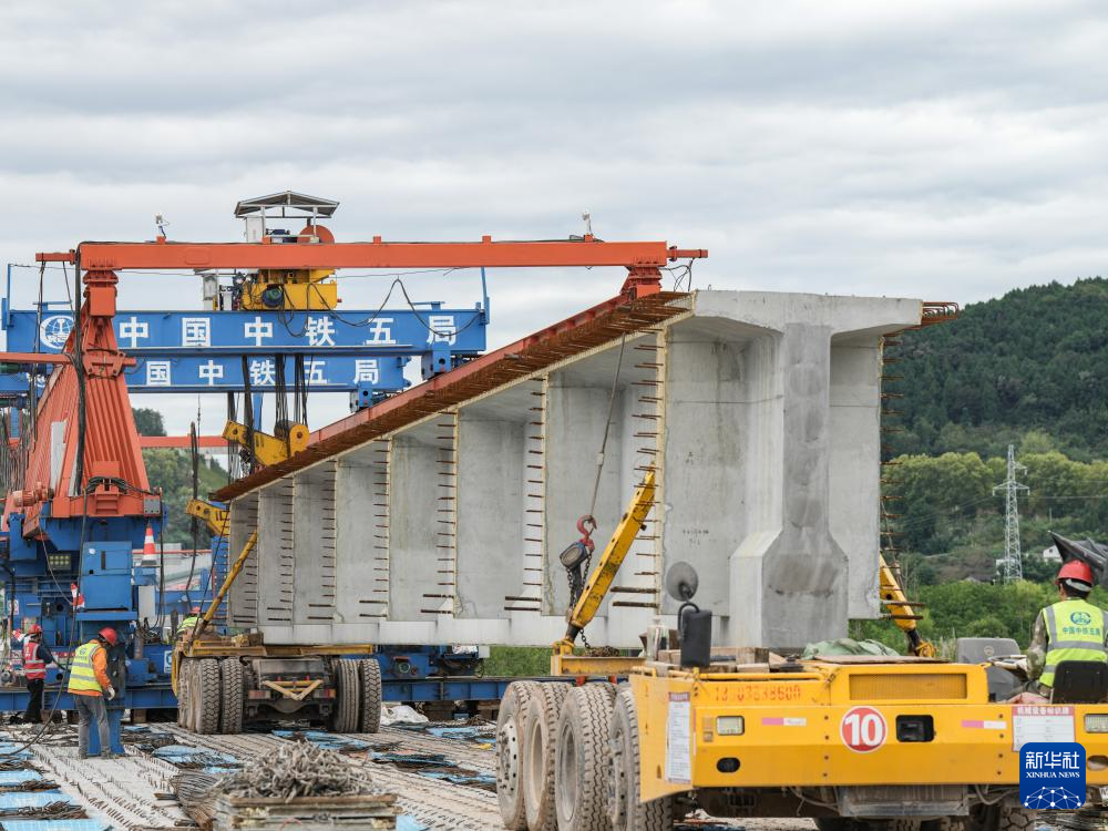 10月12日,在京昆高速广元至绵阳段扩容工程牛头河大桥,工人在进行架梁作业。新华社记者 王曦 摄