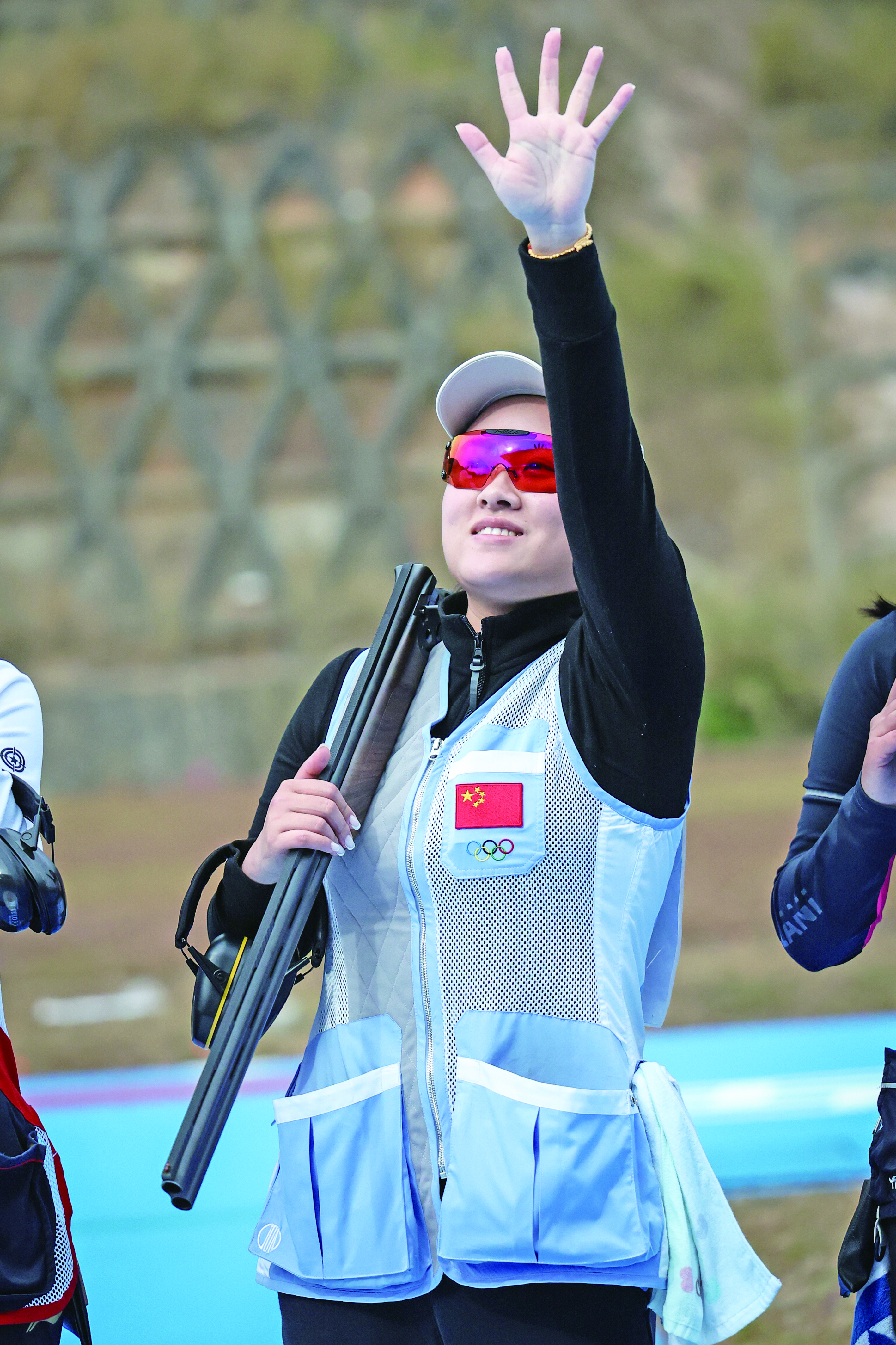 11月19日,冠军重庆选手范馨月在赛后庆祝。 当日,第十五届全国运动会射击项目女子飞碟多向决赛在广州举行。 新华社记者 潘昱龙 摄