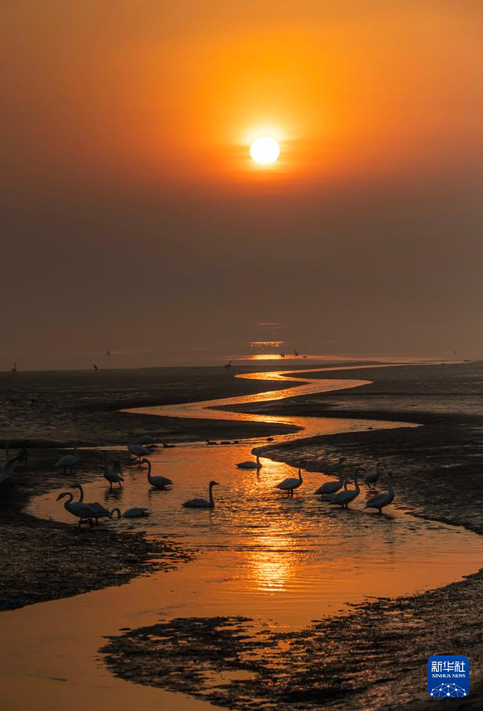 12月7日在山东省荣成市成山镇鸿鹄湾摄影区拍摄的大天鹅。新华社发(李信君摄)