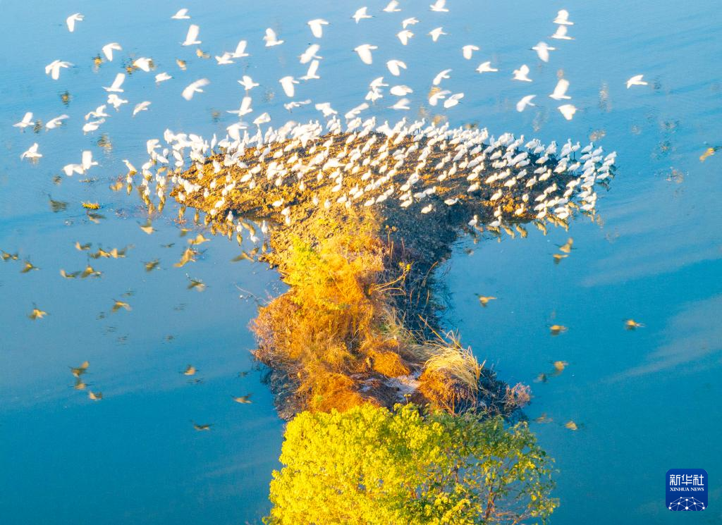 12月6日,群鸟在江苏兴化里下河国家湿地公园内栖息、觅食(无人机照片)。新华社发(周社根摄)