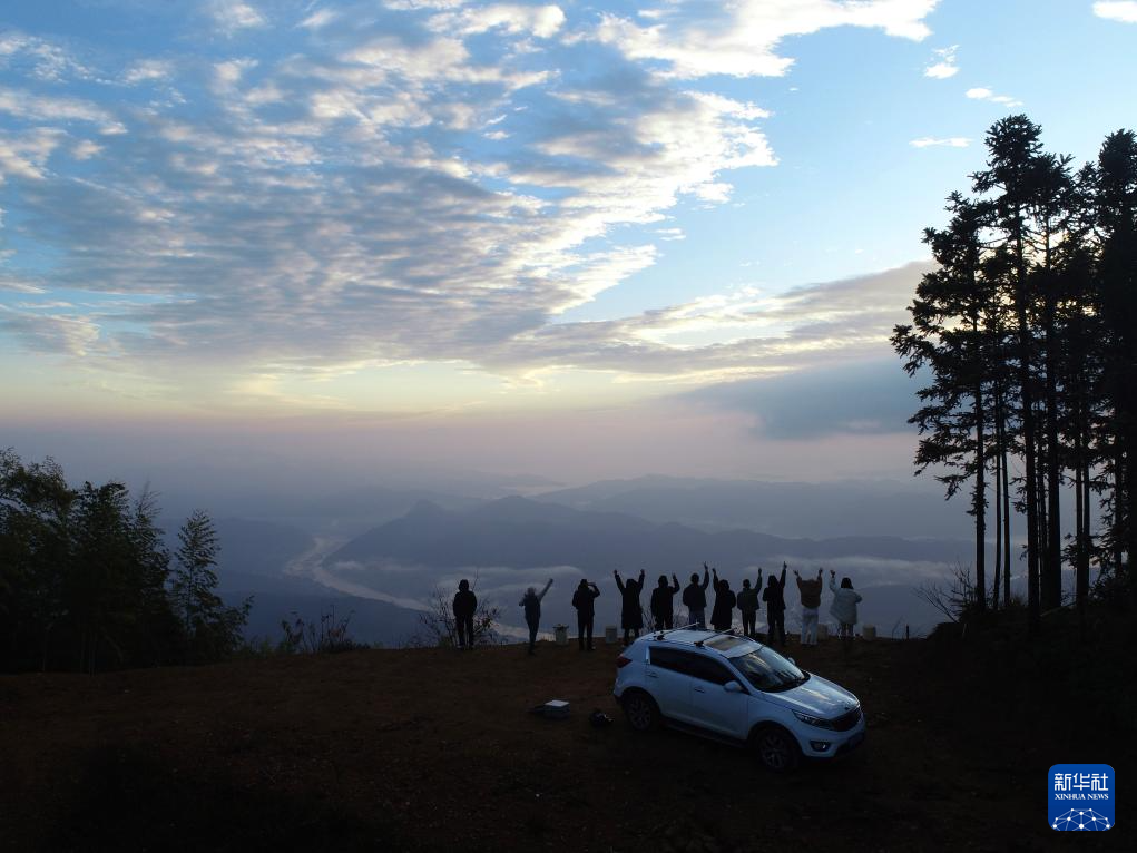 12月14日,在福建省南平市顺昌县高阳乡大富村的龙山观景台,游客自驾观看日出云海(无人机照片)。新华社发(黄杰敏摄)
