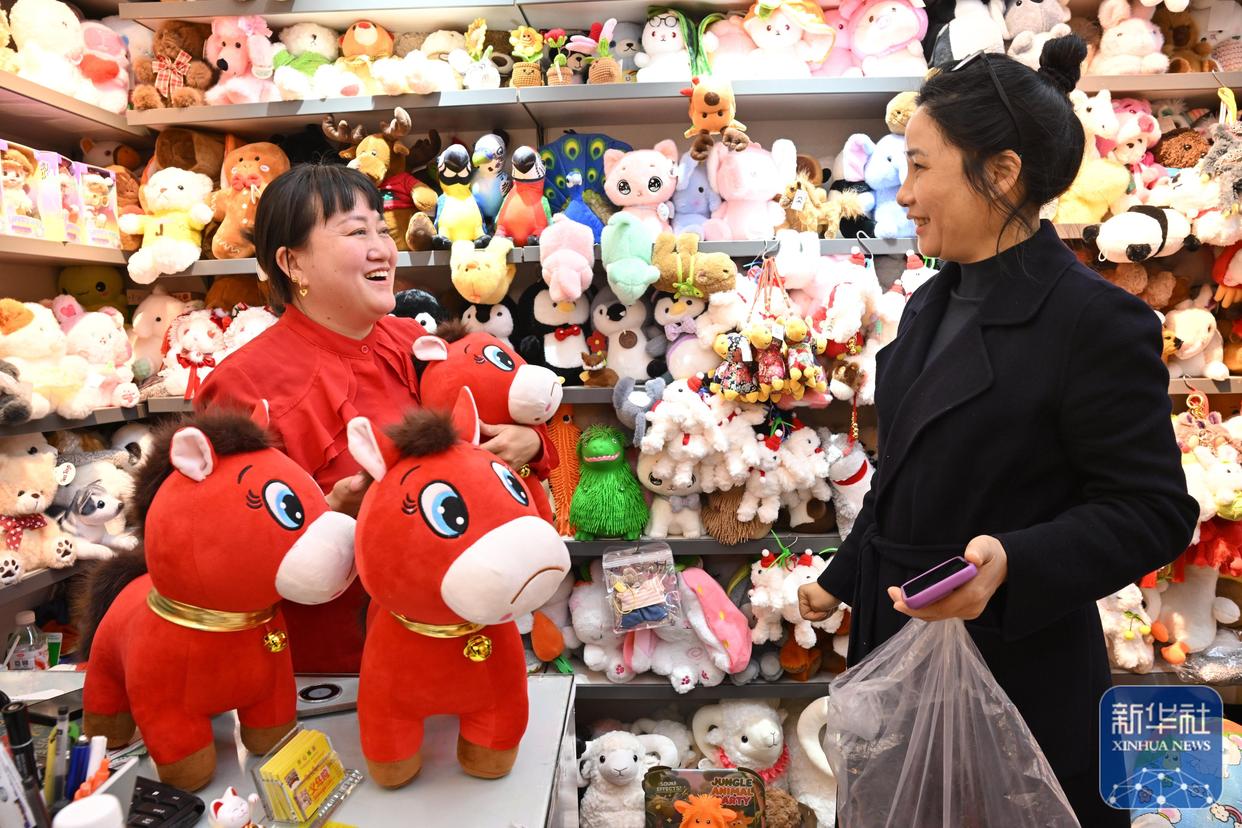 ↑ 1月12日,在浙江义乌市国际商贸城一区玩具销售区,市场经营户“开心姐妹”负责人张火清(左)接待采购商。新华社发(吕斌摄)