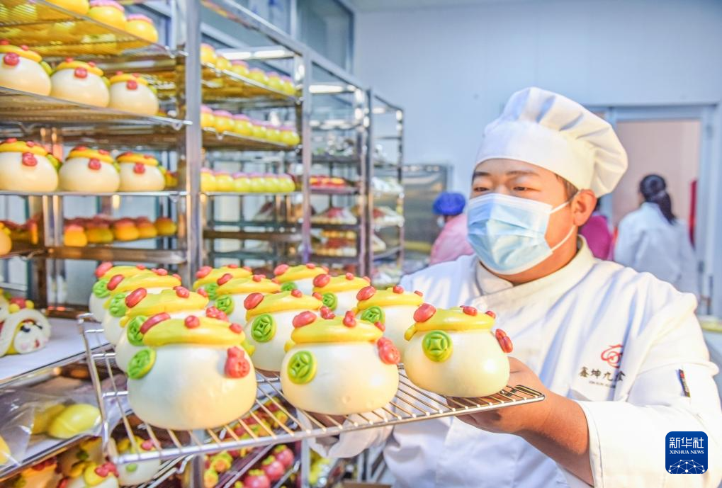 1月13日,在山东省胶州市九龙街道,黑氏传统花馍非遗工坊店主黑尤坤将花馍从货架上取下。新华社发(王昭脉摄)
