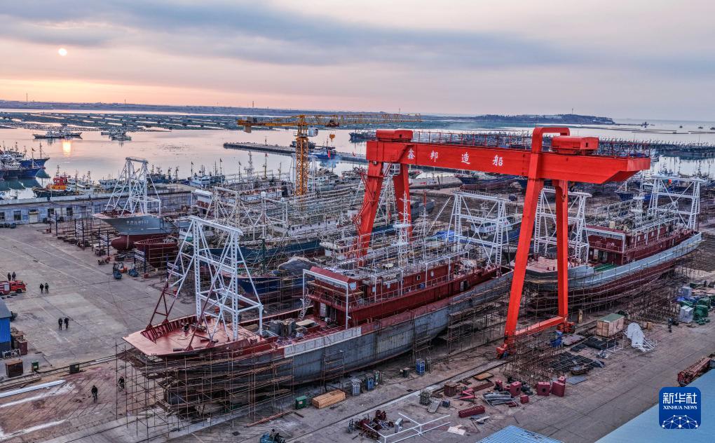 1月28日,在山东省荣成市石岛管理区海工装备产业基地,船舶在维修中(无人机照片)。新华社发(李信君摄)