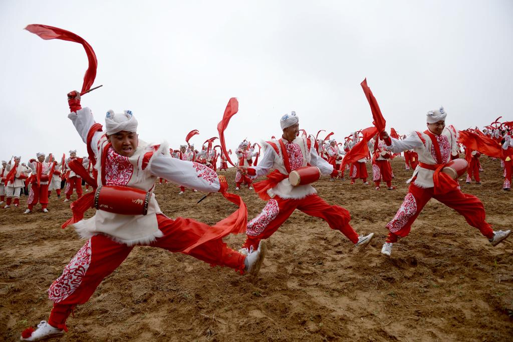 腰鼓手在陕西省延安市安塞区南沟村进行一场山地腰鼓演出。新华社记者 刘潇 摄