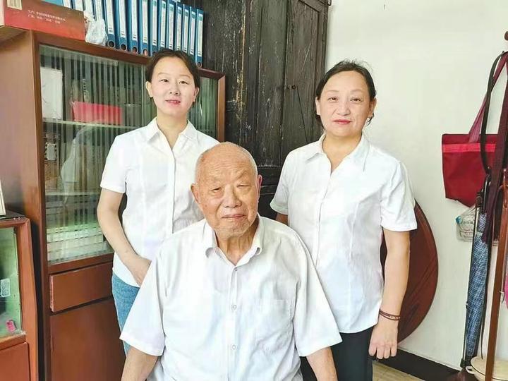 黄冈市级非遗代表性项目“红色革命歌谣”的代表性传承人梅仙桃(右)与父亲梅基癸、女儿袁晓英合影。(麻城市委宣传部供图)