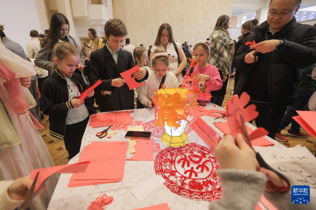 2月14日,在俄罗斯圣彼得堡,当地民众体验剪纸。新华社发(莫京娜摄)