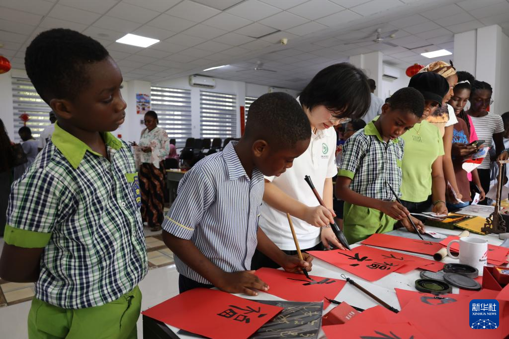 2月13日,在加纳阿克拉,学生在加纳大学孔子学院举行的新春游园会上体验书法。新华社发(赛特摄)