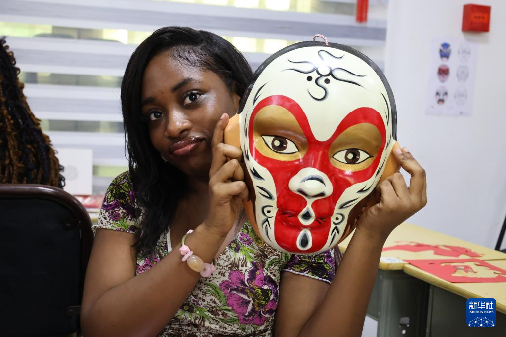 2月13日,在加纳阿克拉,一名学生在加纳大学孔子学院举行的新春游园会上展示中国戏曲脸谱。新华社发(赛特摄)