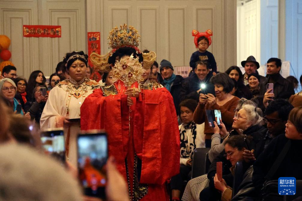 2月14日,在法国巴黎举行的2026年法国汉风新春庆典上,演员身穿中国传统服饰,展示古代婚礼。新华社记者 张百慧 摄