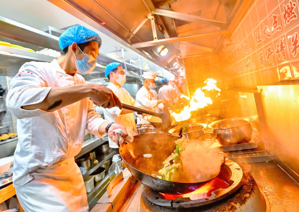 2026年2月18日,天津市滨海新区一家饭店的厨师正在烹制团聚宴菜品。