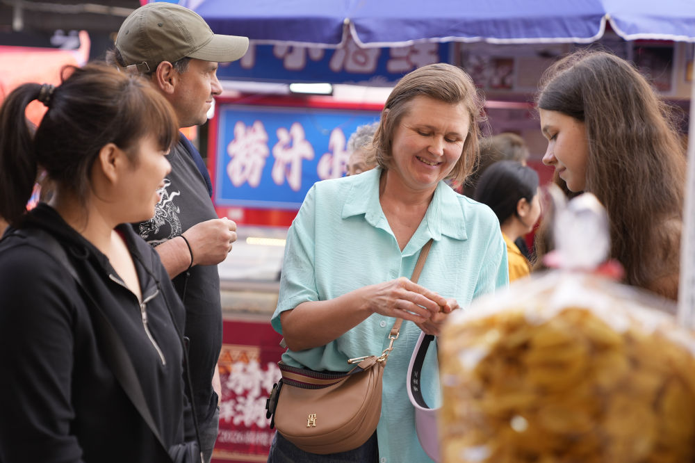 2026年2月4日,来自俄罗斯的游客在海南海口骑楼老街年货集市上选购干果。