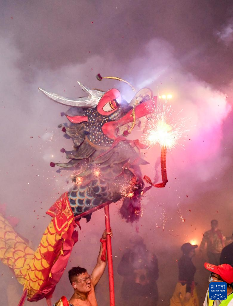 2月27日,在广西宾阳县炮龙文化广场,人们在炮龙节上舞炮龙。新华社记者 陆波岸 摄