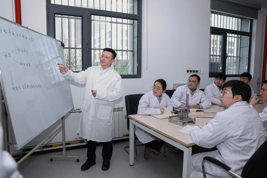 2月13日,在位于山东济南的山东电工电气设备公司工艺实验室,全国人大代表、中国电气装备集团副总经理张帆(左一)主持自粘导线固化特性实验方案讨论。新华社发(中国电气装备集团供图)