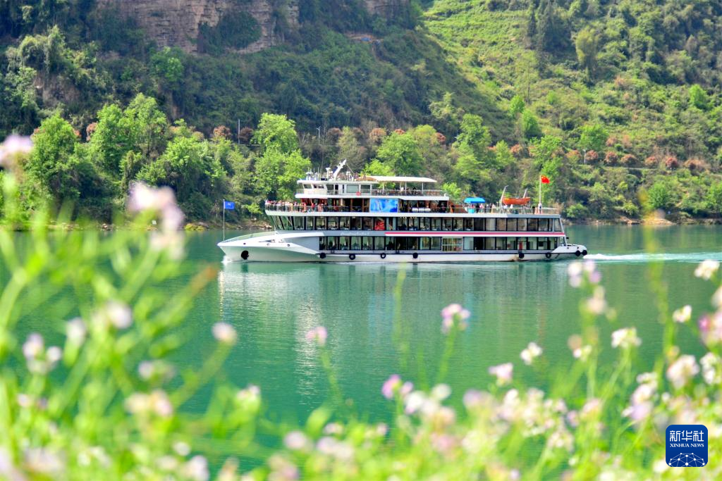 4月4日,在湖北省宜昌市夷陵区乐天溪镇境内的长江西陵峡水域,游客乘坐“长江三峡”7号游船游览峡江春景。新华社发(张国荣摄)