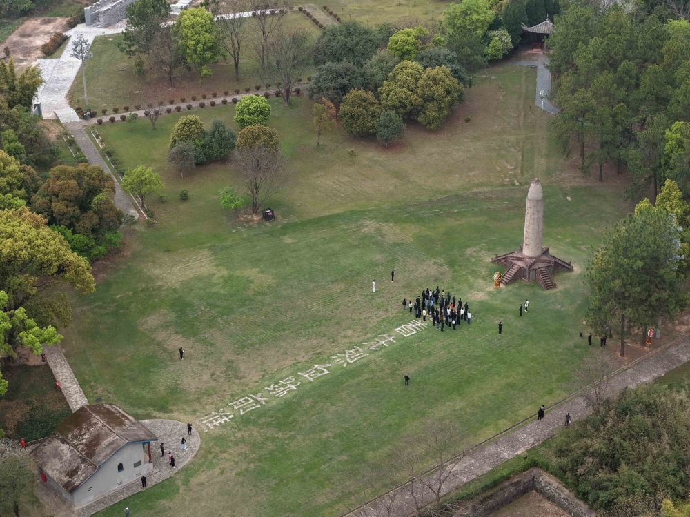 游客在江西省瑞金市叶坪革命旧址群红军烈士纪念塔前缅怀先烈(2026年3月20日摄,无人机照片)。新华社记者 周密 摄