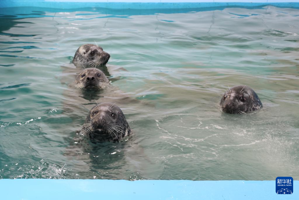 这是4月15日在辽宁省农业科学院所属辽宁省海洋水产科学研究院拍摄的斑海豹,这群被救治的斑海豹因健康状况未达标而无法放归,被安置于一个单独的水池中进行人工饲养。新华社记者 韩赫 摄