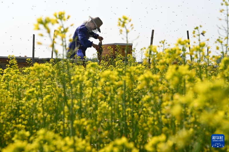 4月25日,蜂农在河南省沁阳市崇义镇南里村一处白菜种子田里放蜂采蜜。新华社发(杨帆摄)