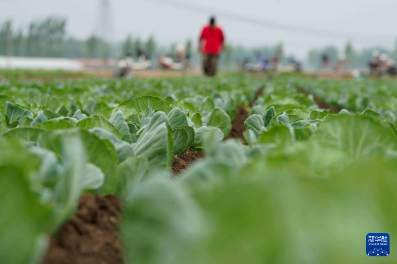 4月26日,河北省唐山市玉田县虹桥镇农民在菜田管护幼苗。新华社发(刘满仓摄)