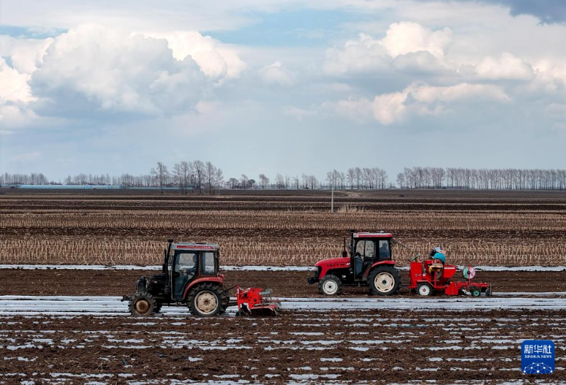 4月26日,黑龙江省富锦市上街基镇农民驾驶农机进行马铃薯覆膜播种作业(无人机照片)。新华社发(曲玉宝摄)