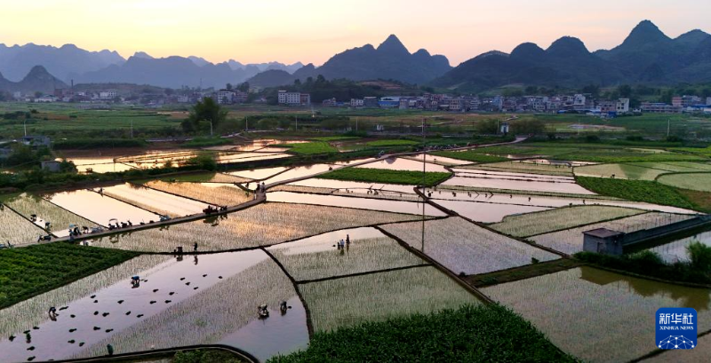 4月25日,农民在广西来宾市忻城县城关镇都乐村田间进行早稻插秧(无人机照片)。新华社发(樊绍光摄)
